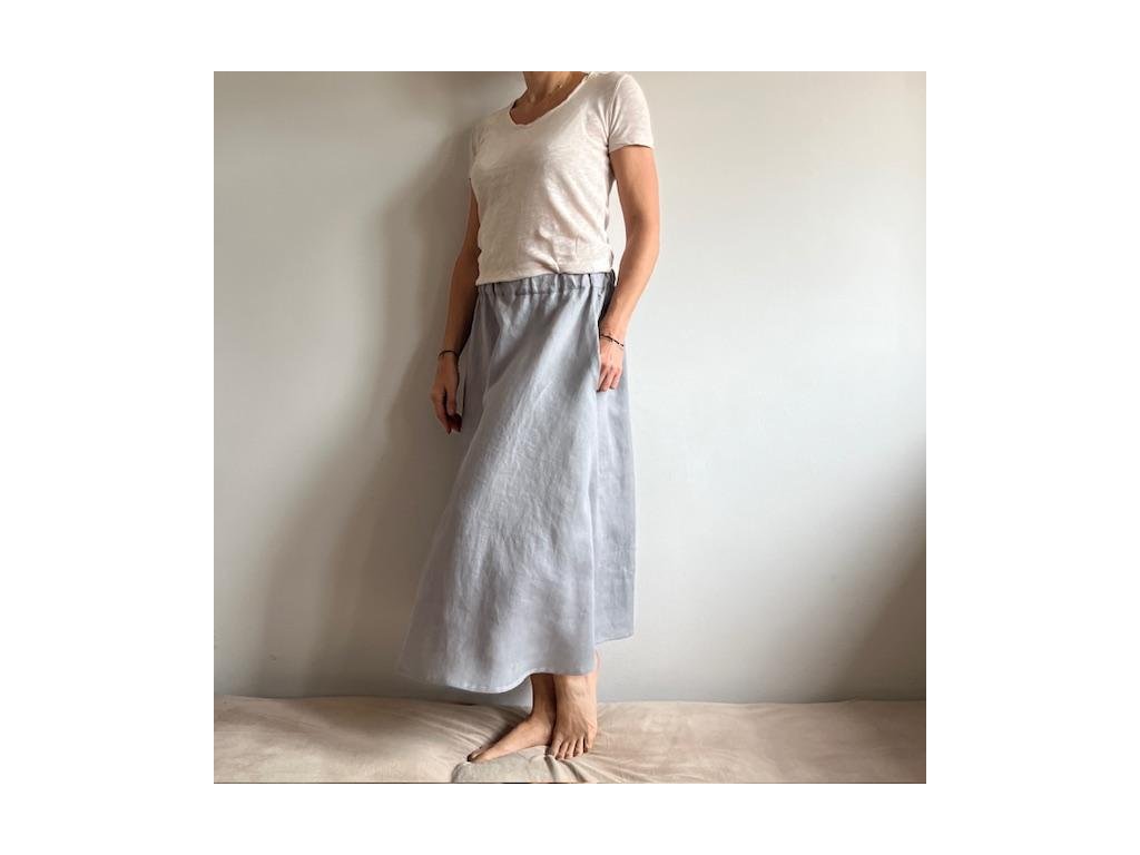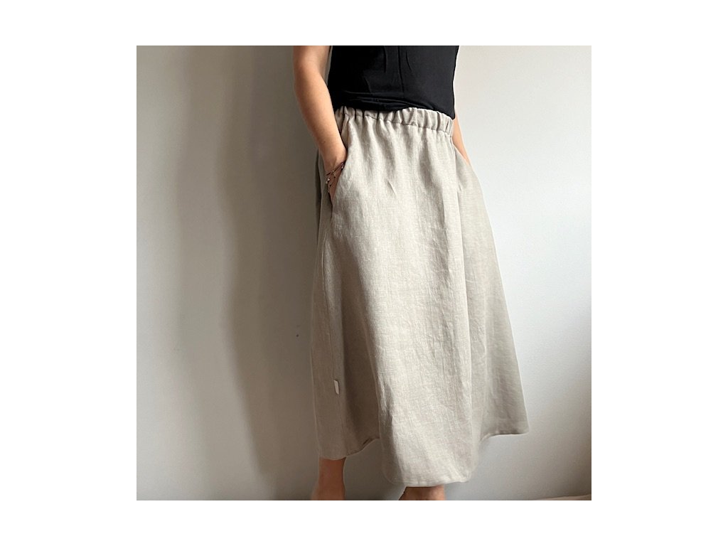 Dlouhá lněná sukně s kapsami z přírodního 100% lnu je lehká, prodyšná a ideální pro letní dny i celoroční nošení. Len o gramáži 185 g/m² je příjemný na dotek, v létě chladí a v zimě udržuje teplo. Sukně má nadčasový střih ve tvaru A, který lichotí každé postavě. Jedna strana je hladká, druhá nařasená, což vytváří jemný kontrast a zajišťuje univerzální využití.