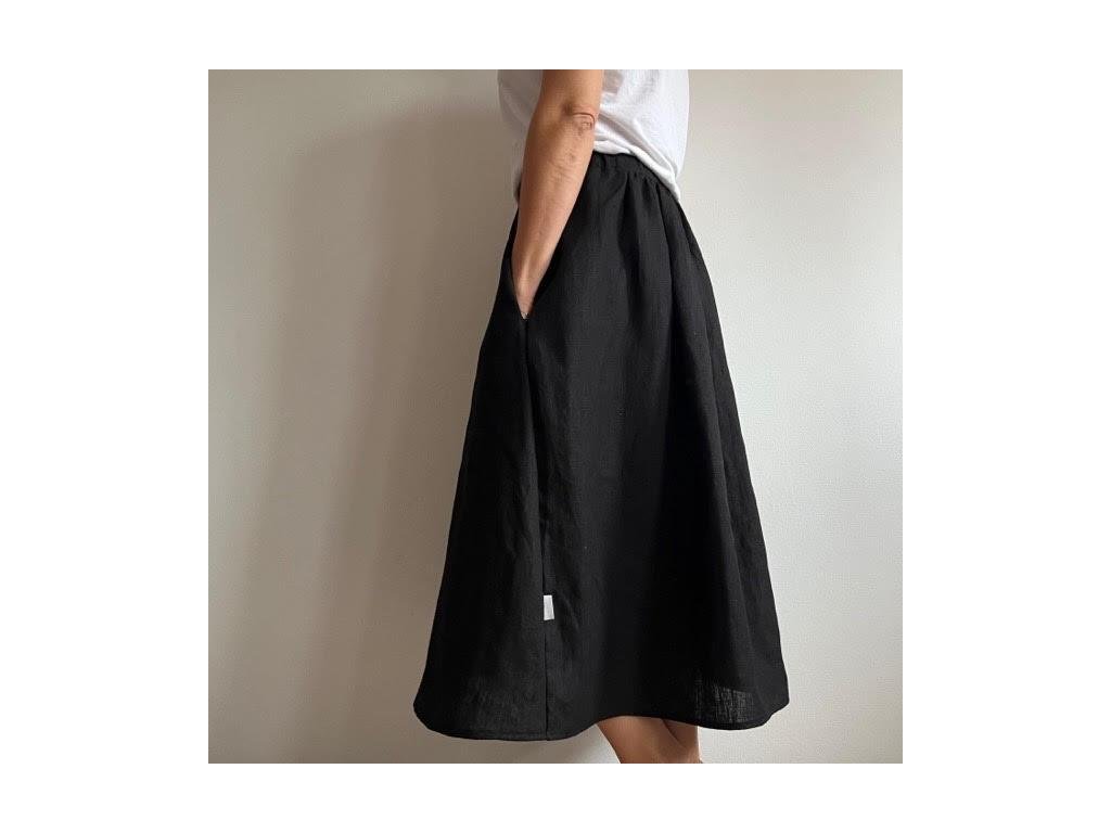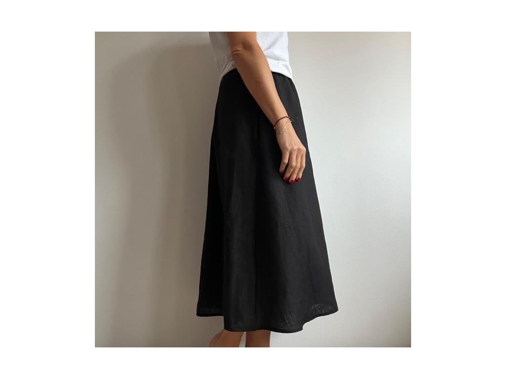 Sukně je pod kolena, kopíruje tvar písmene A, rafinovaného střihu. Jeden díl je nařasený a druhý hladký do A a tak je zcela univerzální a hodí se pro každou postavu... Sukně má vnitřní kapsy. V pase je na gumu, je na vás, zda budete nosit do pasu nebo spadlou na boky.