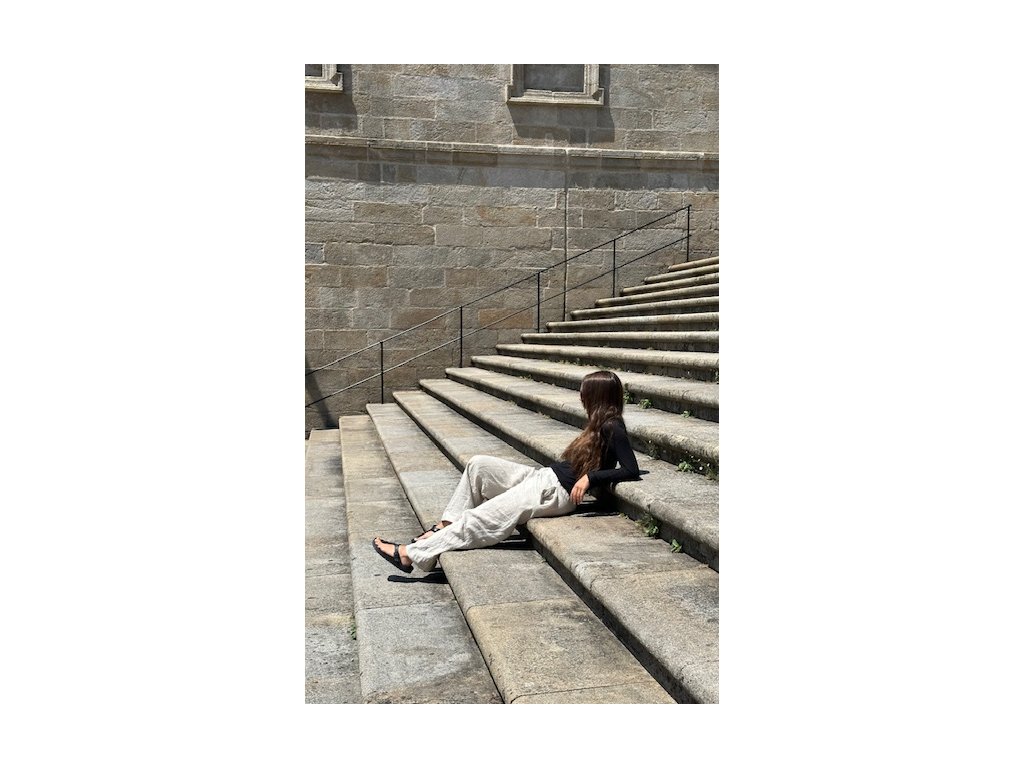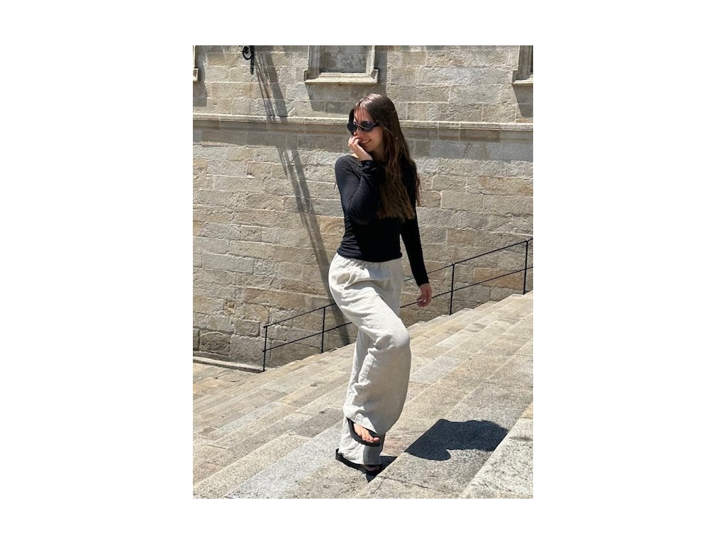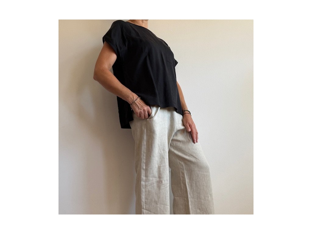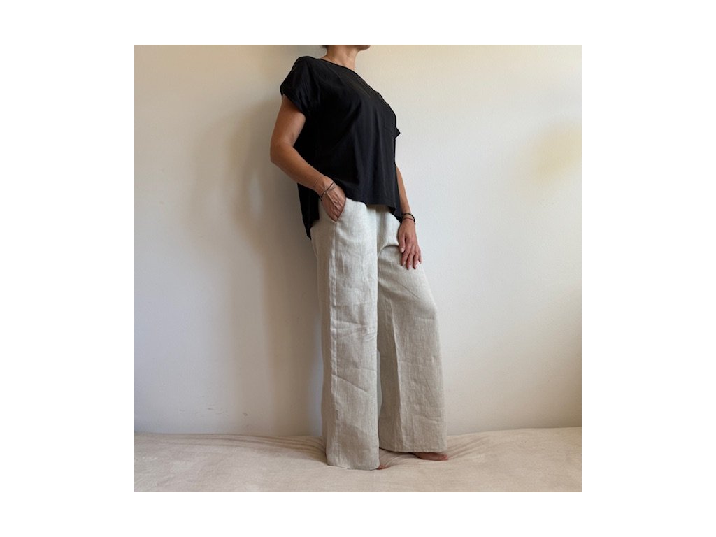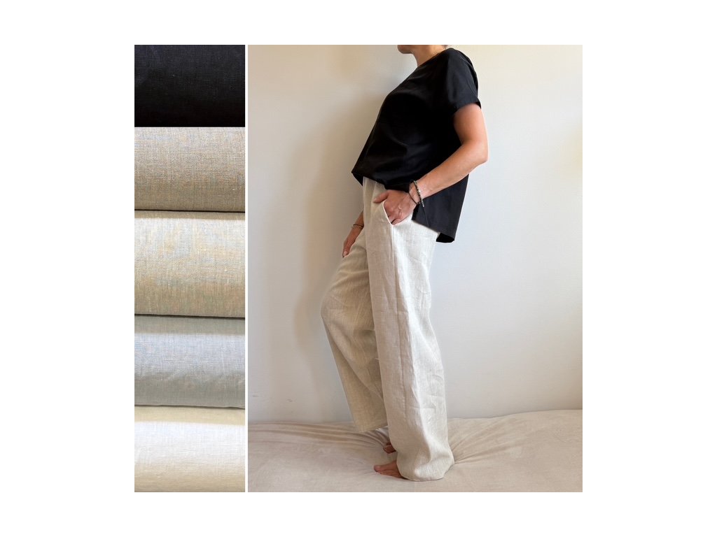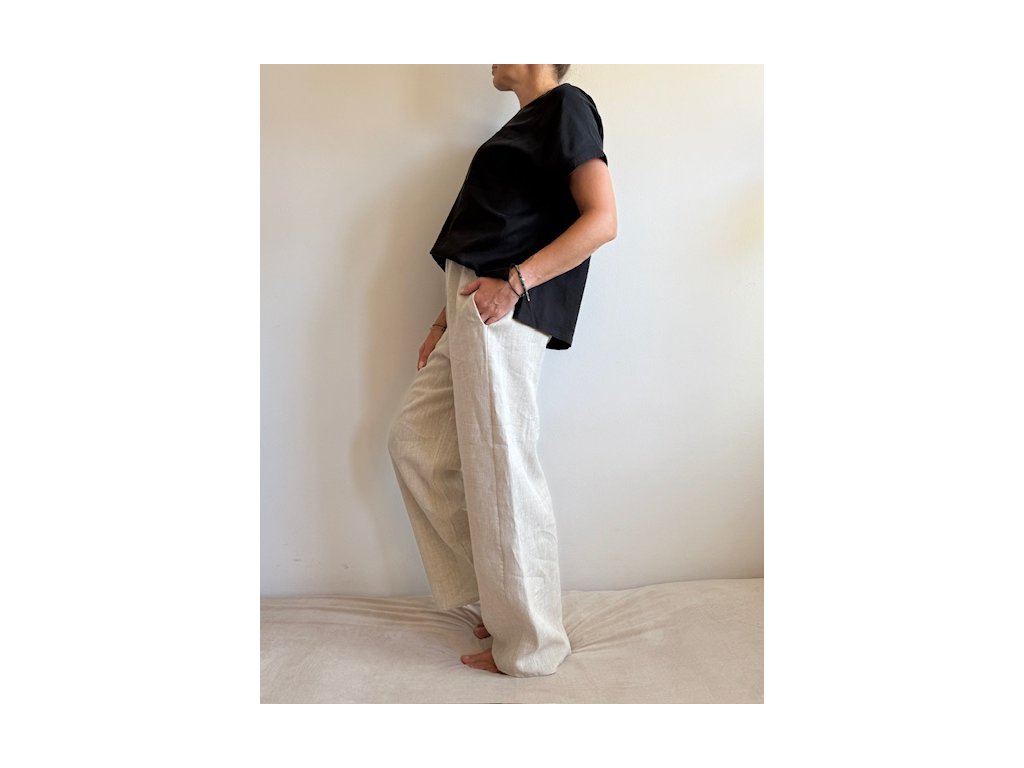 Kalhoty mají praktické skryté kapsy a elastický pas, který se pohodlně přizpůsobí vaší postavě – můžete je nosit vysoko na pase nebo ležérně na bocích. Jsou ideální nejen na procházky, cestování nebo práci z domova, ale také jako pohodlné lněné pyžamo.