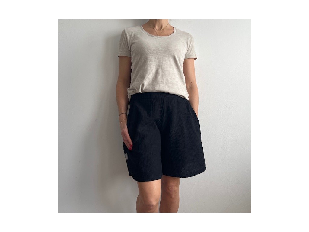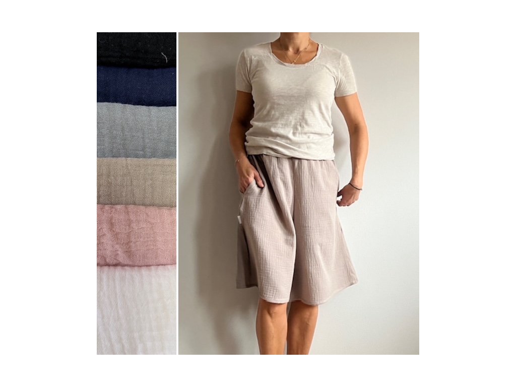 Mušelínové kraťasy v délce ke kolenům jsou příjemně rozšířené, střihově působí jako kalhotová sukně. V pase jsou kraťasy na gumu, můžete nosit do pasu nebo spadlé na boky.