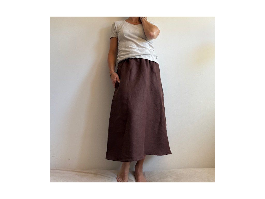 Lněná sukně s kapsami do půli lýtek - Hnědá