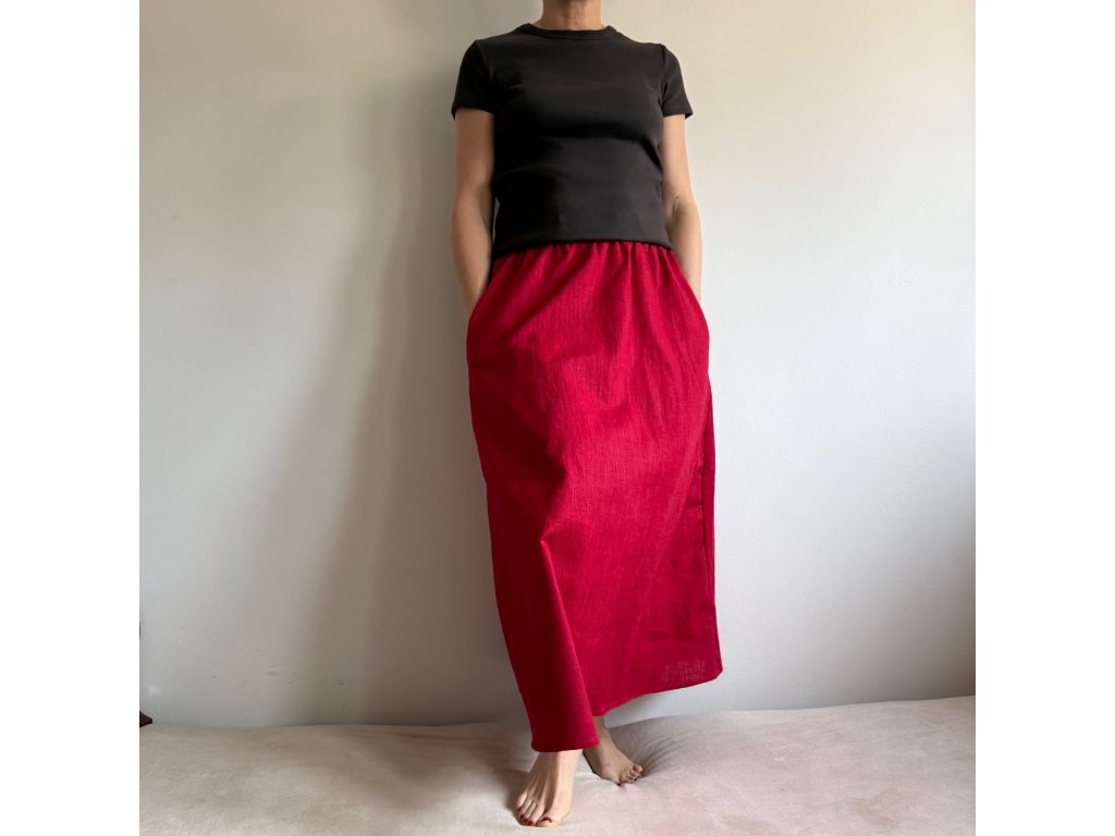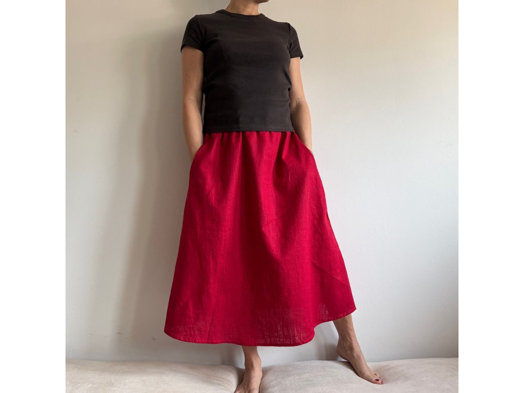 Lněná sukně s kapsami do půli lýtek - Červená