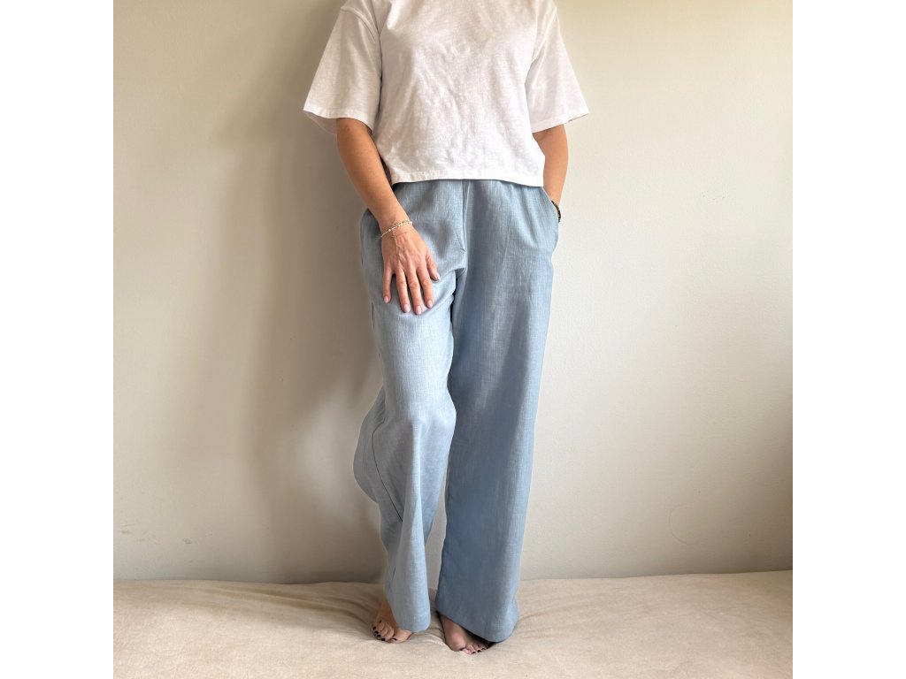 Kalhoty mají praktické skryté kapsy a elastický pas, který se pohodlně přizpůsobí vaší postavě – můžete je nosit vysoko na pase nebo ležérně na bocích. Jsou ideální nejen na procházky, cestování nebo práci z domova, ale také jako pohodlné lněné pyžamo.